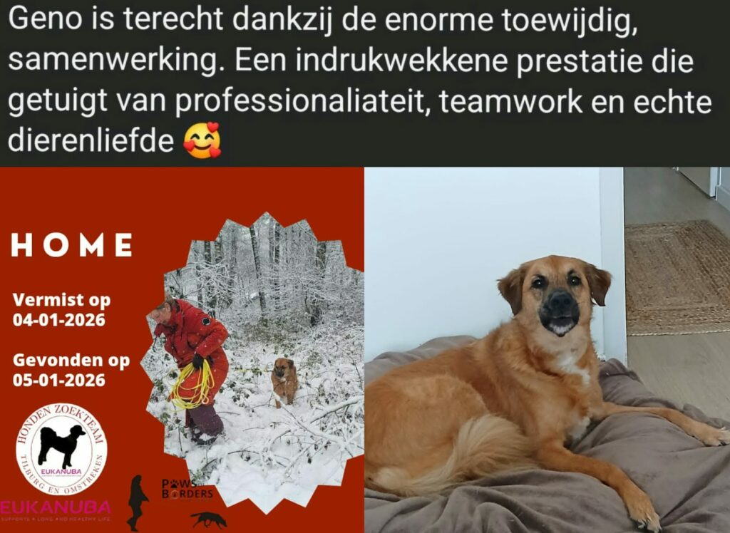 Ondanks het slechte weer hebben we direct een flyer en een zoekapp aangemaakt. Diverse beheerders en vrijwilligers zijn op locatie gegaan. Geno moest zo snel mogelijk gevonden worden met deze barre weers- omstandigheden. Agenten van politieteam leydal stapten in de app en gingen mee zoeken. Later stapte ook de dierenpolitie in de app. Vanmorgen is miriam van paws of borders gaan speuren. Beide honden gaven hetzelfde stuk bos aan en in eerste instantie zagen we daar geen Geno. Nadat er met een warmtecamera gekeken werd zagen we Geno